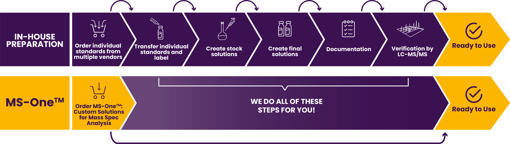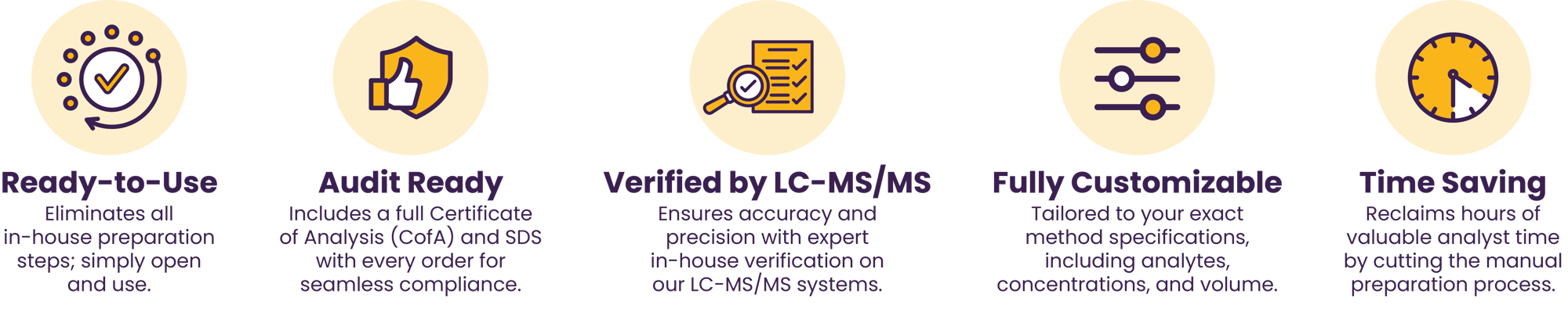 MS-One™ provides fully verified calibrators, controls, and internal standards built to your exact method, saving hours of prep while ensuring consistency, compliance, and precision.